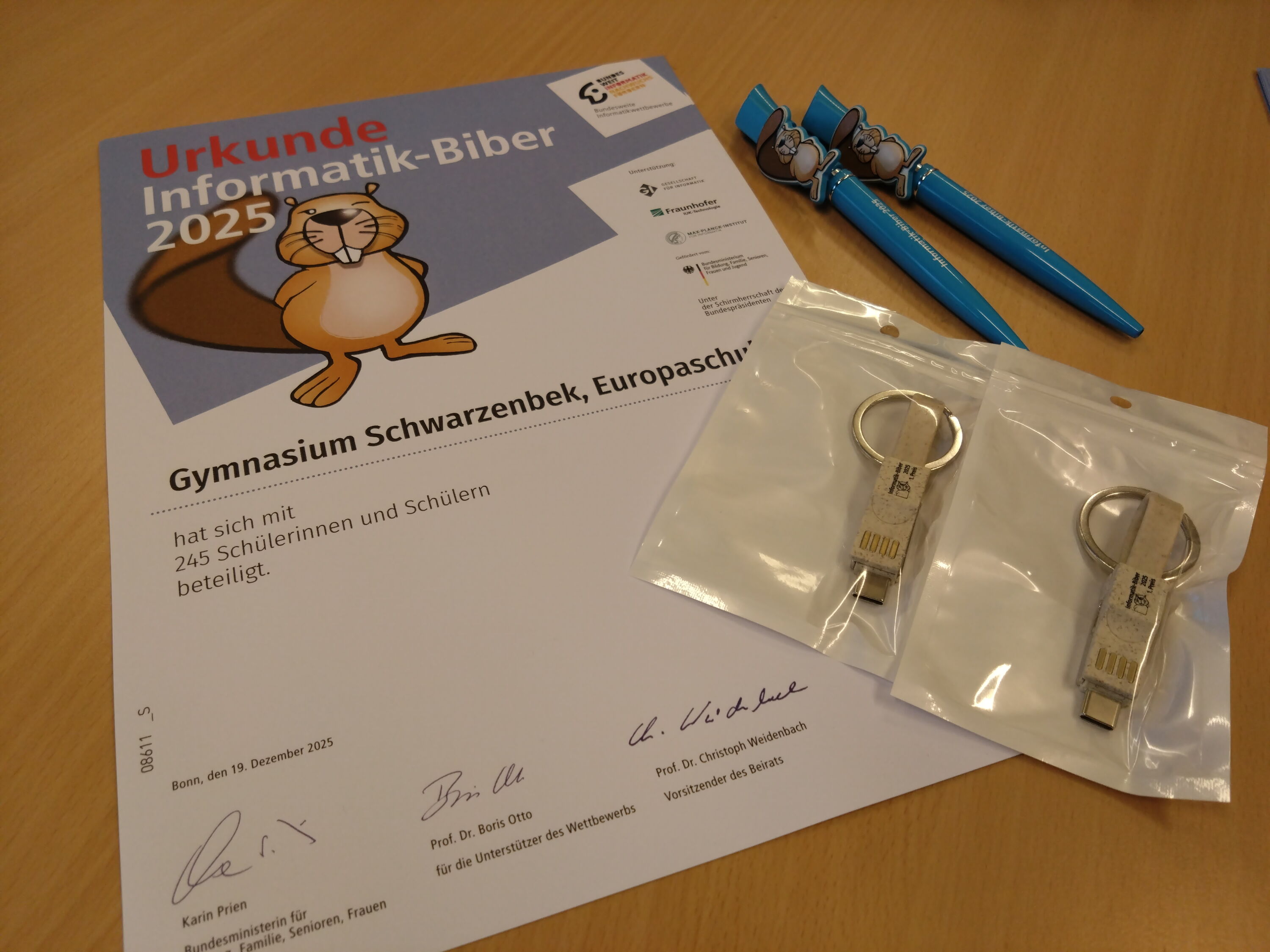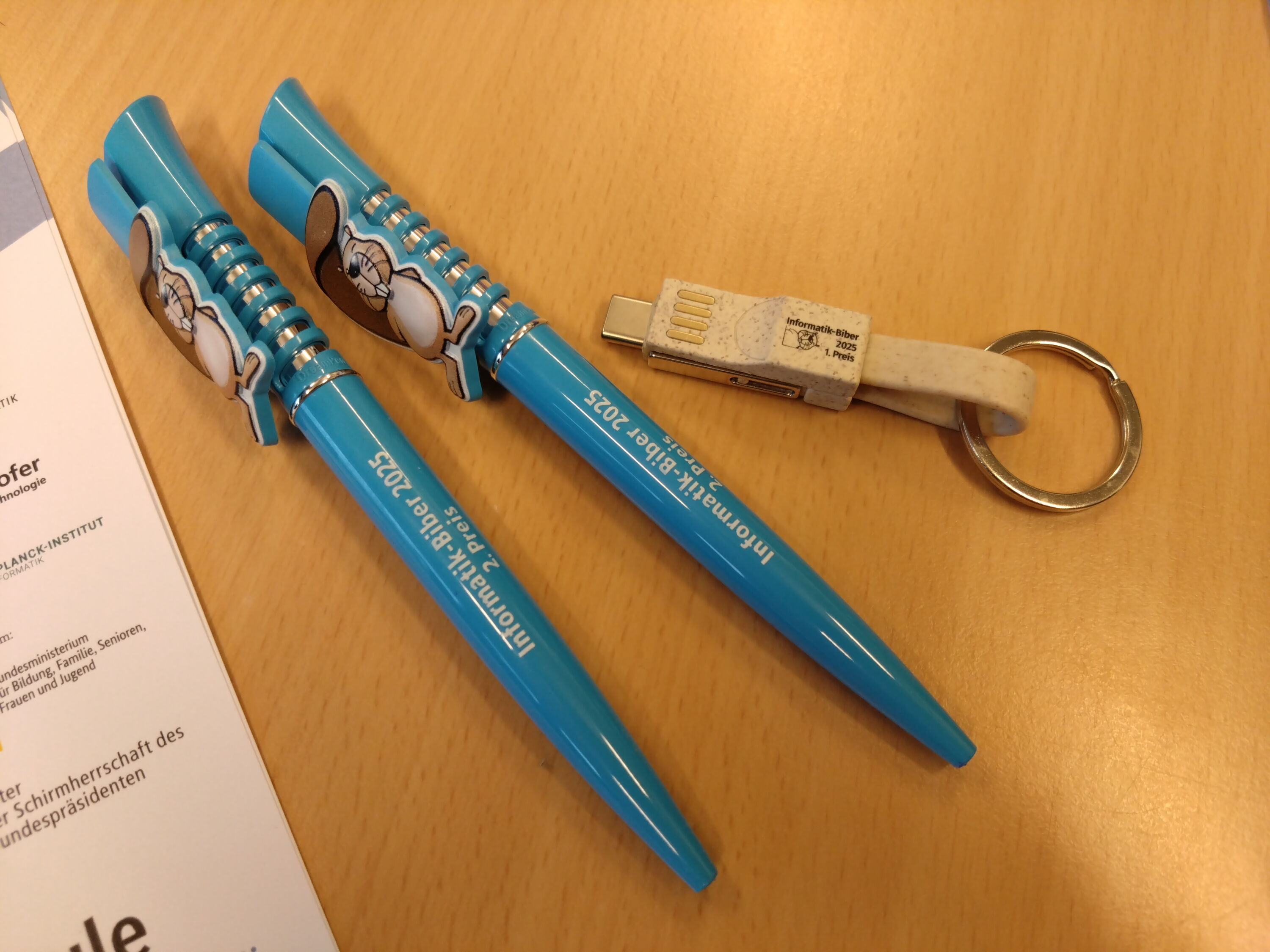 Die Gewinner des ersten Preises erhielten ein USB-Kabel; die Zweitplatzierten konnten sich über einen Informatik-Biber- Kugelschreiber freuen. Alle Teilnehmerinnen und Teilnehmer bekamen eine Urkunde, um die Teilnahme am Wettbewerb zu ehren. Insgesamt war es ein sehr gelungener Wettbewerb im Jahr 2025.