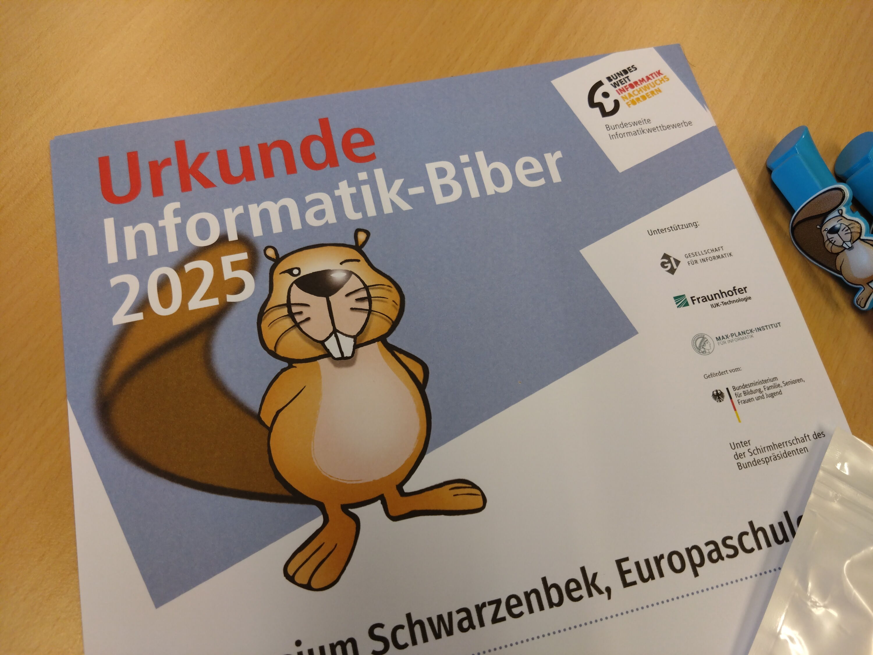 Im November 2025 haben 245 Schülerinnen und Schüler unserer Schule am Informatik-Biber-Wettbewerb teilgenommen. In diesem Jahr wurde gleich achtmal der 1. Preis und elfmal der 2. Preis an Schüler des Gymnasiums Schwarzenbek vergeben. Darauf kann man sehr stolz sein kann, denn die Ersten liegen unter den Besten 2,5% Deutschlands und die Zweiten unter den besten 3,5%!