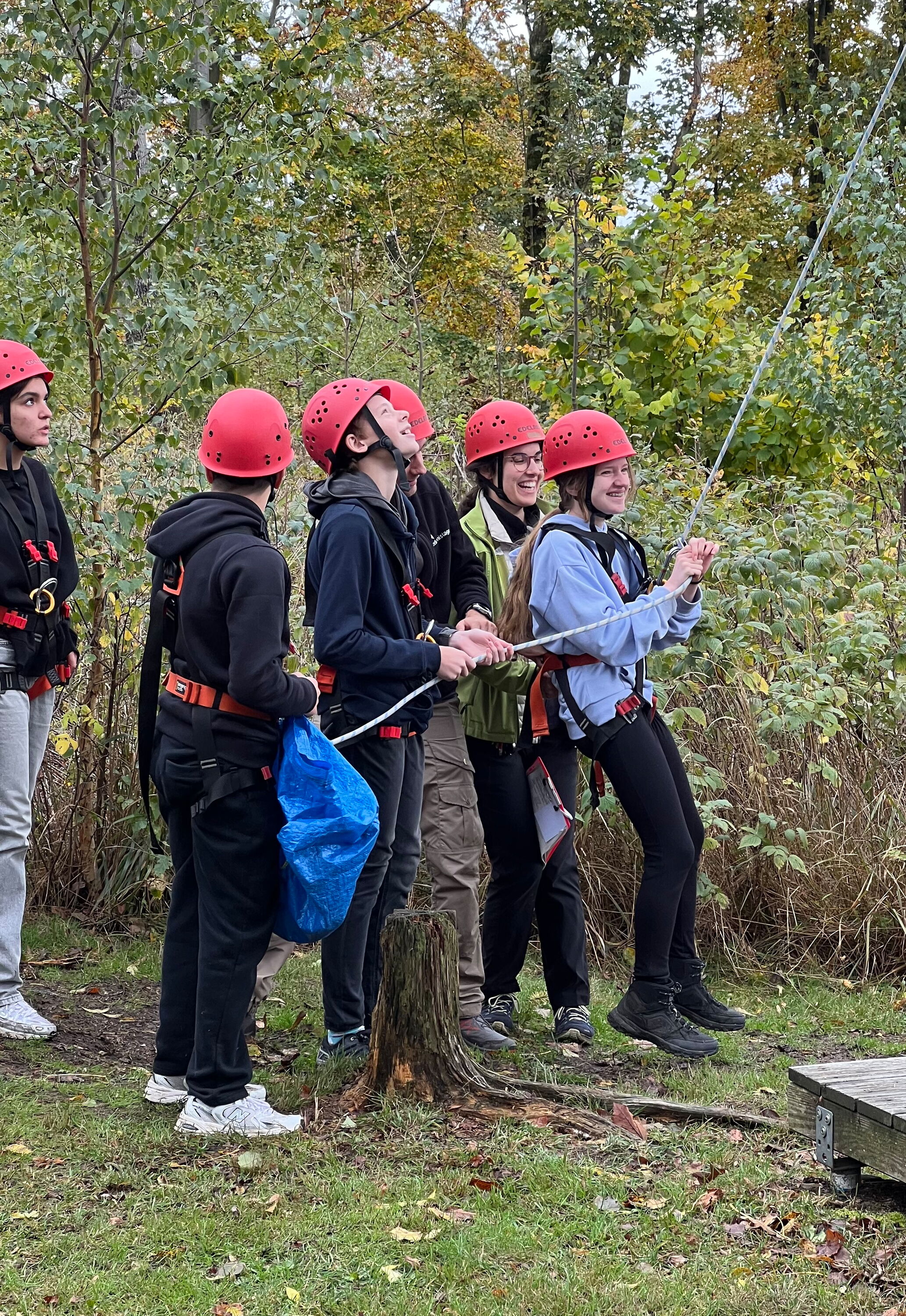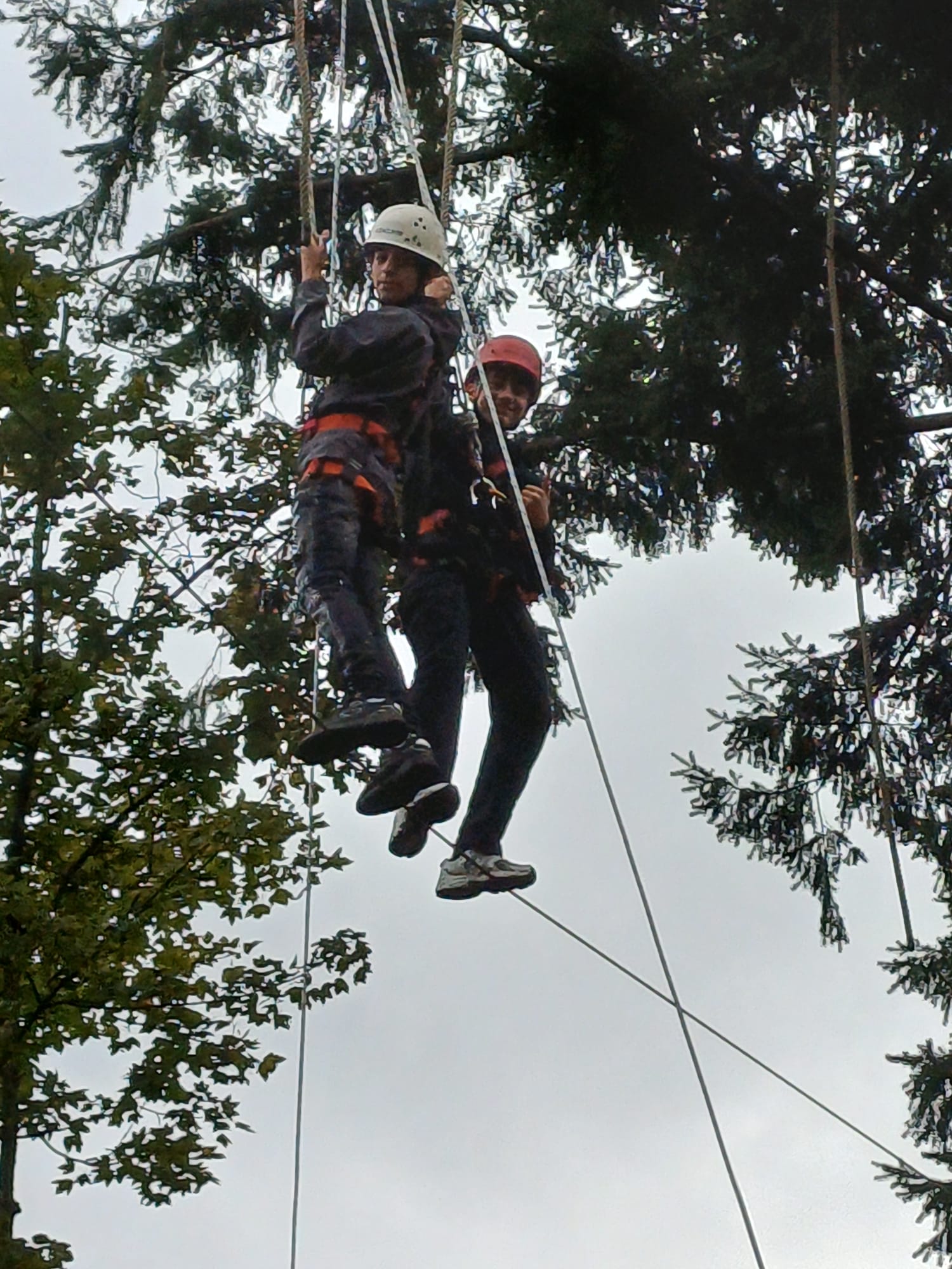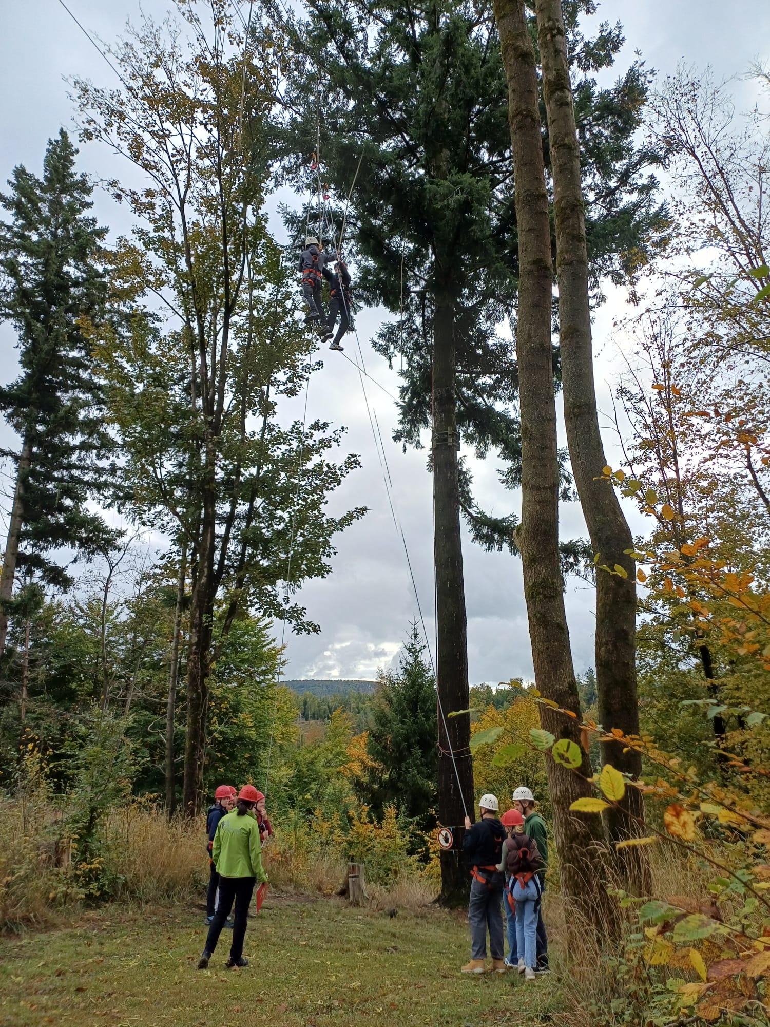 Die wohl größte Herausforderung hatten wir dann am Donnerstag: Nach einem schnellen Frühstück und einer Einweisung ins Anlegen der Sicherheitsgurte und das Sichern durften wir endlich zum praktischen Teil übergehen und sind zur Kletterstelle marschiert. Es war eine echt schöne Erfahrung auf einem 10 Meter hohen Stahlseil zu balancieren. Als sich einige nicht getraut haben, musste Frau Witt mit gutem Beispiel hinterher und hat die Kletteraktion auch noch mitgemacht.