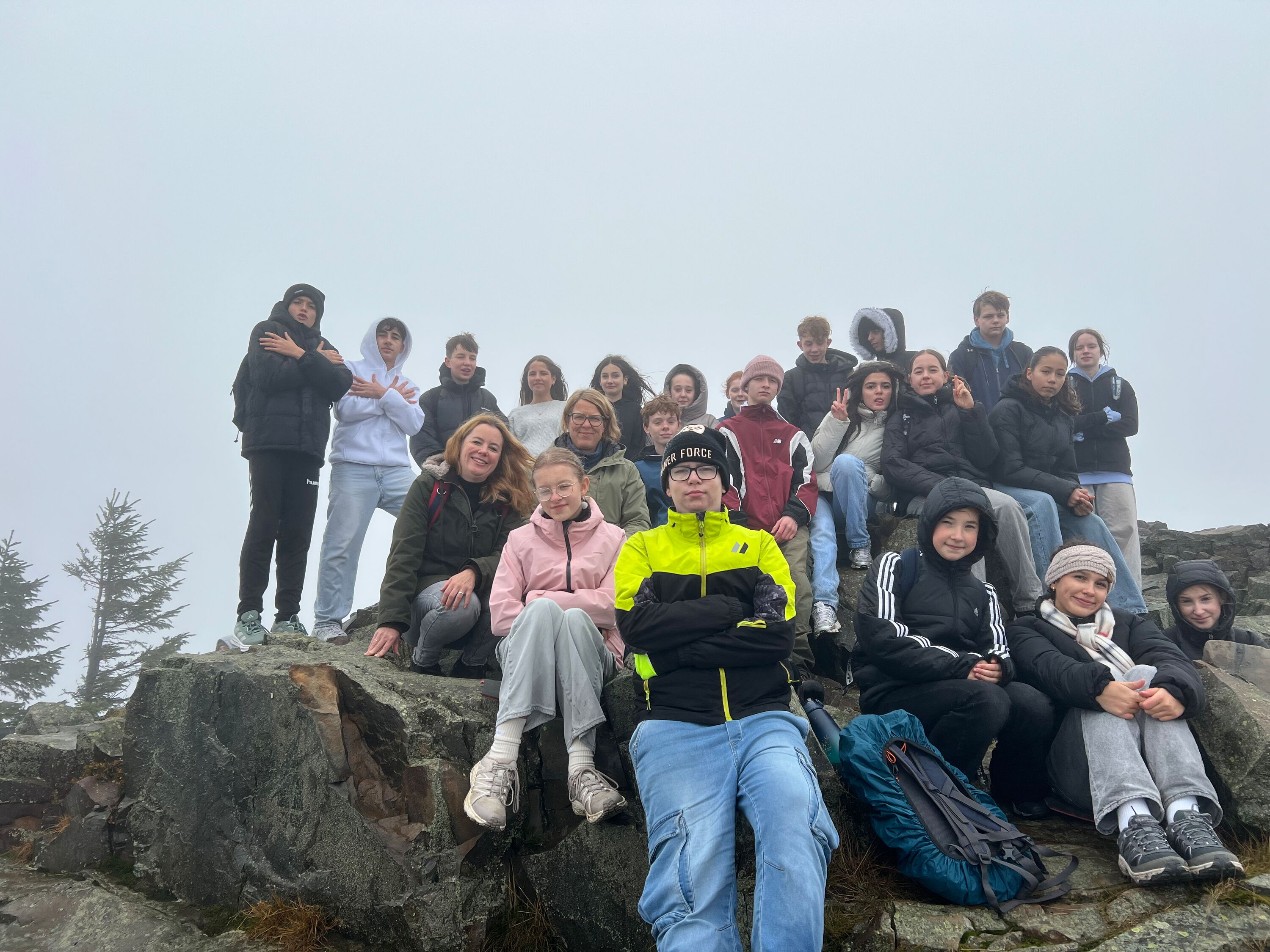 Vier Schüler haben sich freiwillig gemeldet, uns mithilfe einer Landkarte und einem Kompass sicher auf den Berg und wieder herunter bis nach Braunlage zu führen. Oben auf dem Berg konnte man zwar aufgrund des Nebels nicht viel erkennen, aber wir haben trotzdem ein schönes Foto von uns gemacht.