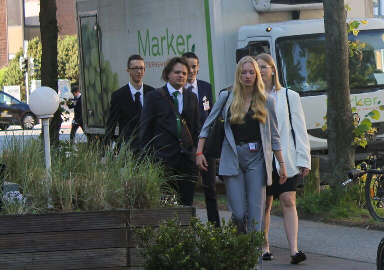 Einmal mehr hat sich dabei gezeigt, wie sehr die Veranstaltung die Schüler/-innen in ihren Bann zog. Auch wenn der Einstieg überfordernd wirken kann, hat nach den ersten Tagen eine Begeisterung für die Veranstaltung bei allen Delegierten eingesetzt. Das liegt sicher nicht zuletzt an dem interkulturellen Austausch, da auch dieses Jahr wieder Delegierte aus Italien, Frankreich, den Niederlanden, Schweden, der Türkei, Estland und Ghana teilgenommen haben. Nicht nur an den langen Arbeitstagen war hier viel Zeit für den Austausch, sondern auch auf vielen Partys und gemeinsamen Aktivitäten. Ein Highlight war wie jedes Jahr natürlich auch der gemeinsame Besuch unserer Delegation bei Peter Pane.