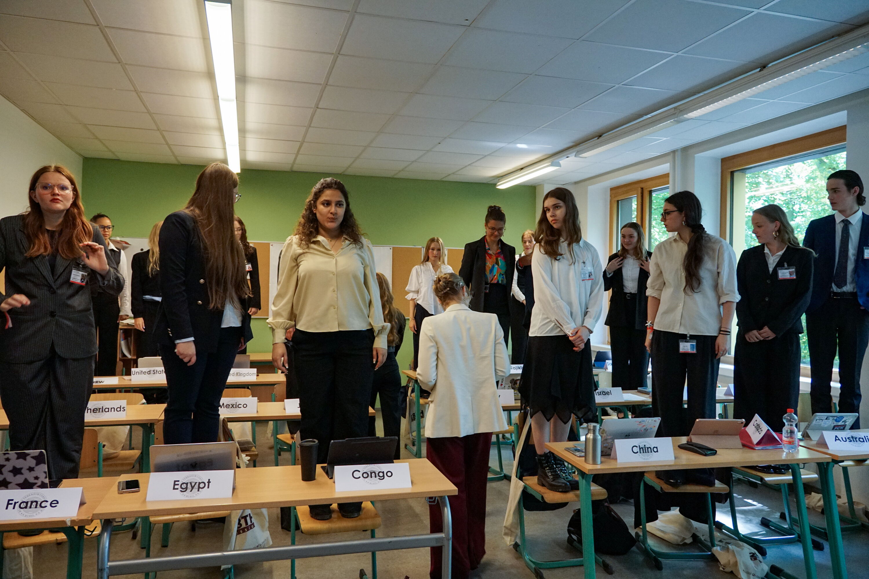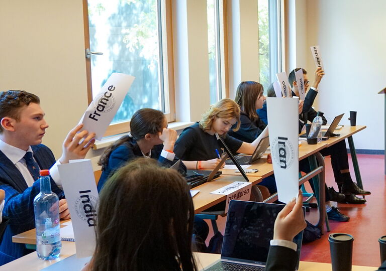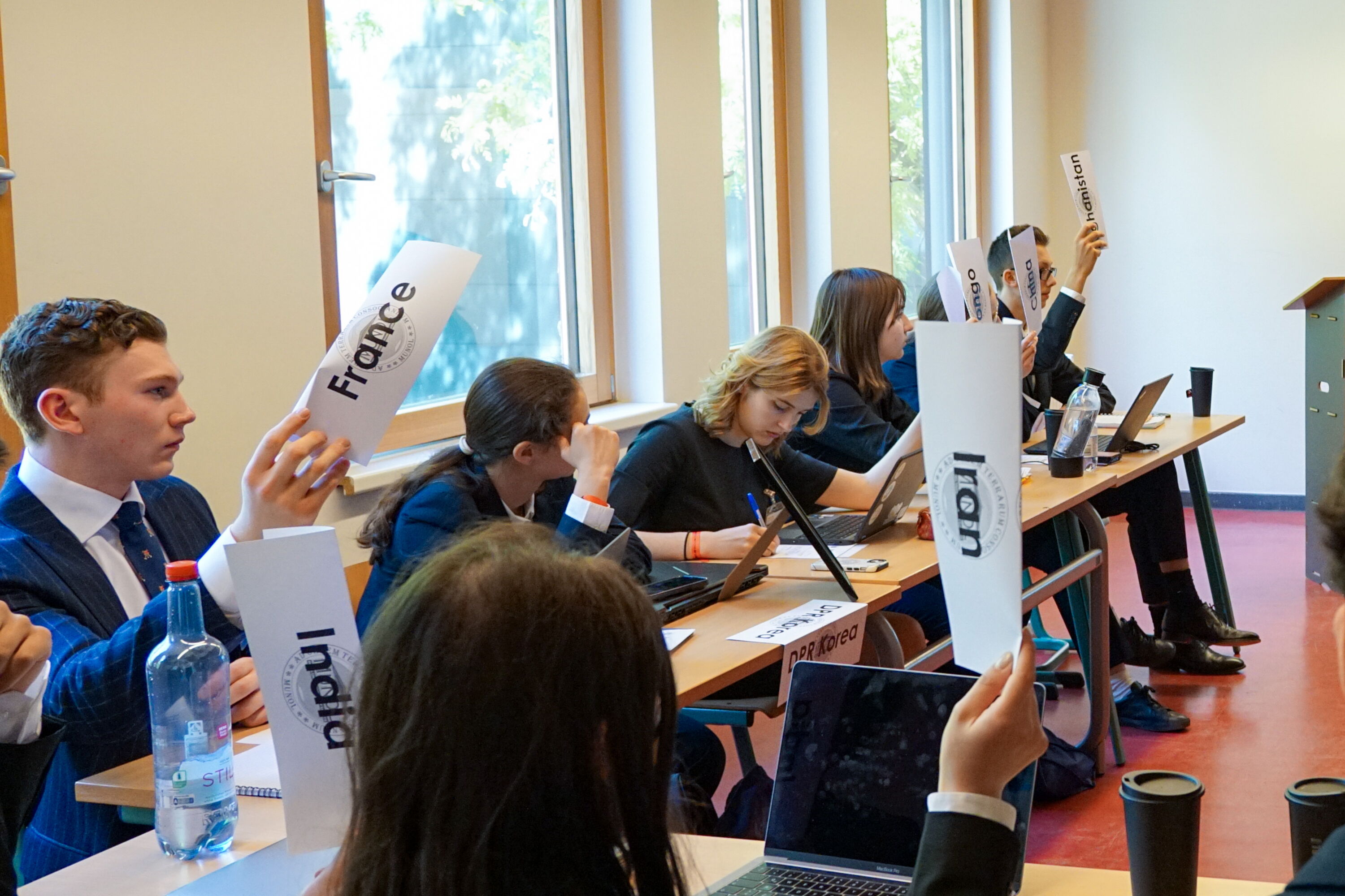 Dieses Jahr stand unsere Gruppe aus fünf motivierten Schüler/-innen vor einer besonderen Herausforderung: Nicht nur, dass unser Land – Afghanistan - aktuell nur eine Exilregierung hat und kein Land aktiv verwaltet; zusätzlich ist ihre Politik zu Teilen von islamistischen Tendenzen durchsetzt und machte das Rollenspiel um einiges anspruchsvoller. Dennoch haben sich alle mit vollem Elan an die Aufgabe gewagt und ihr Bestes gegeben, was in vielen Reden, Fragen an die anderen Delegierten und Mitarbeit an hochwertigen Resolutionen und ihren langwierigen Debatten führte. Dabei haben sie Themen wie die Internationale Sicherheit, die soziale Entwicklung weltweit, die Sicherung kultureller Güter, Frauenrecht und internationale Krisen in verschiedener Weise betrachtet und diskutiert.