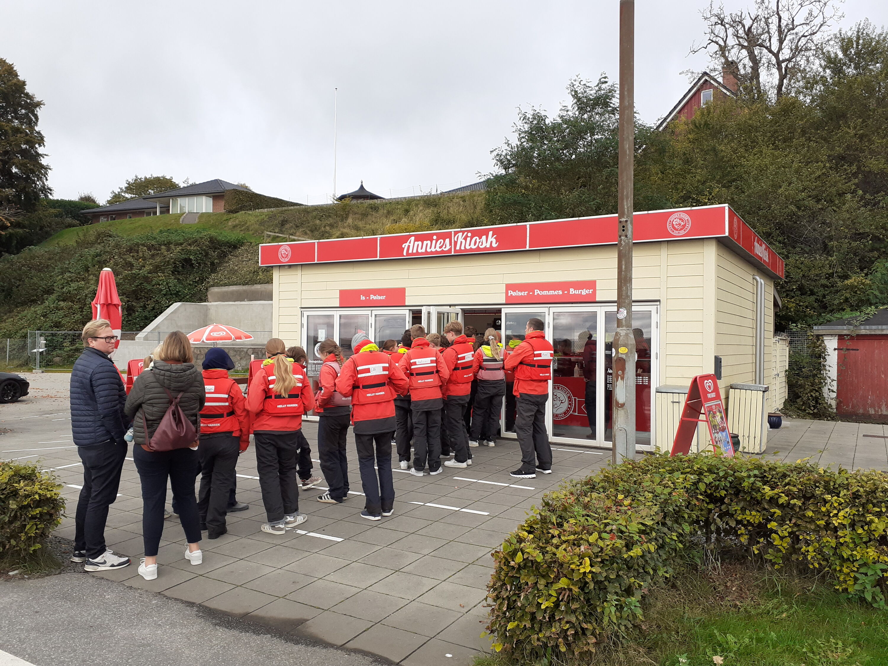 Wir sammelten uns nach dem Auslaufen aus dem Hafen wieder draußen auf See im Bojenfeld und fuhren dann in einer Schlange Richtung Dänemark. Kurz vor der Küste Dänemarks ankerten wir mit drei Booten hintereinander und wurden von Phillip mit dem Speedboot ans Land gebracht. Dort gab es bei Anni’s Softeis, Hotdogs und Pommes, dies war sehr lecker und verdiente seinen guten Ruf.