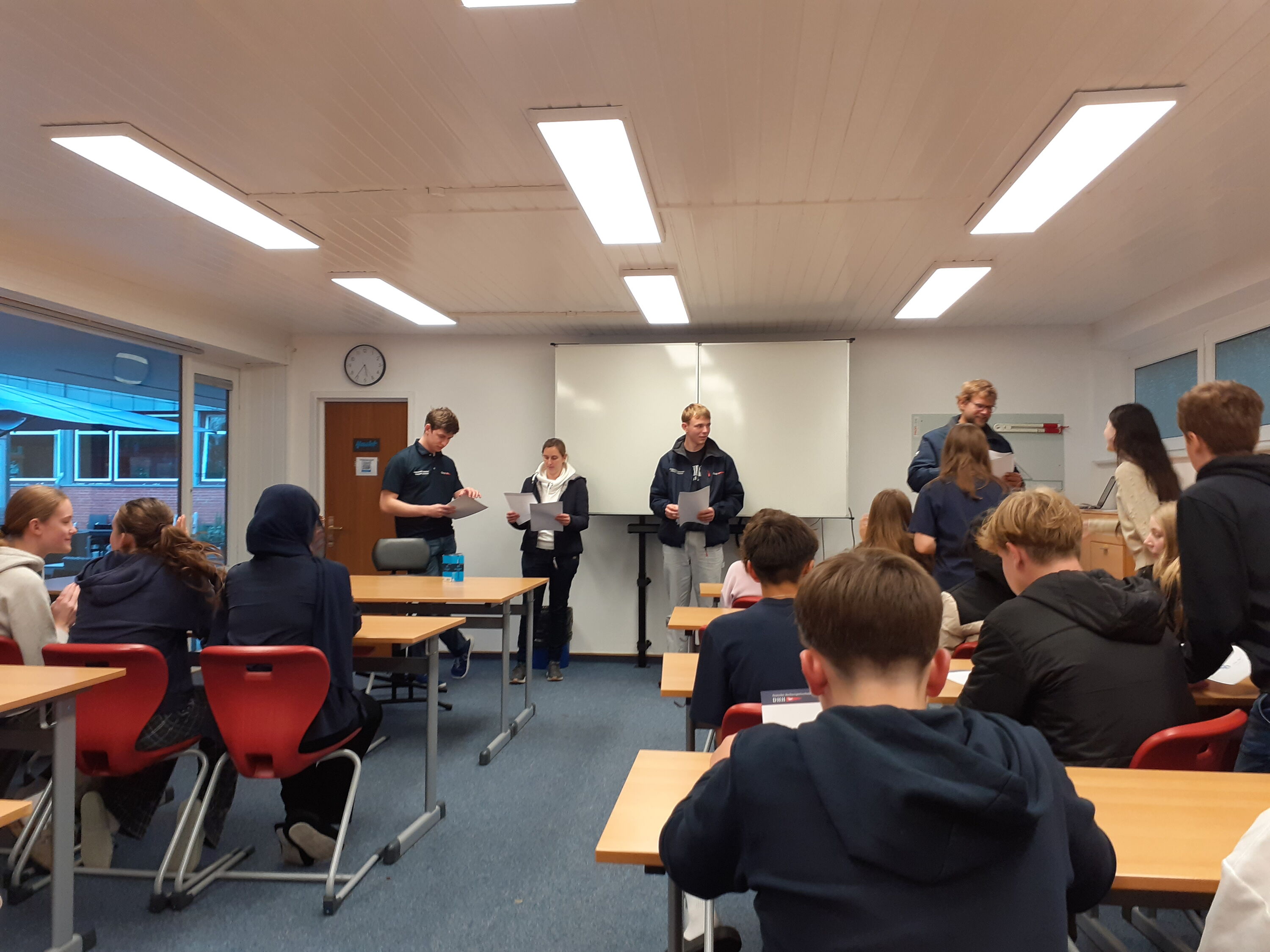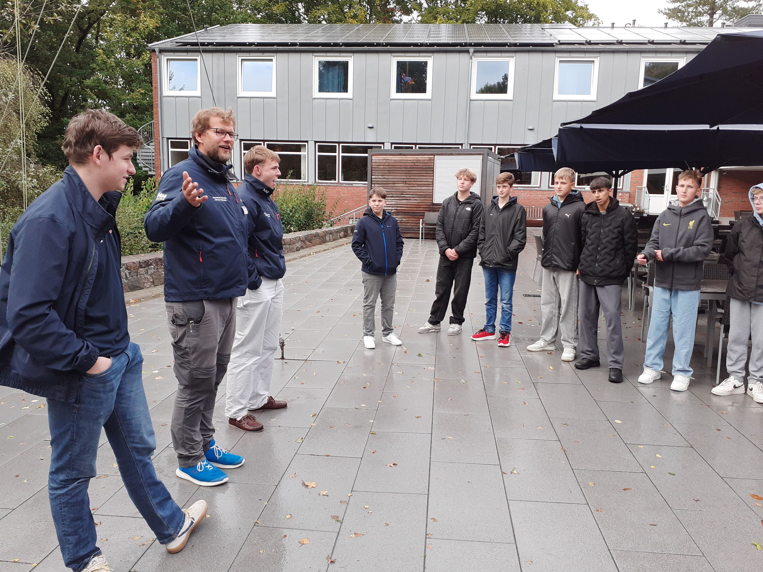 Der Montag begann um Punkt 7:00 Uhr mit einem von Till, dem derzeitigen „Lehrer vom Dienst“ ausgewählten Lied über die hauseigenen Lautsprecher, mit dem wir geweckt wurden. Besonders war der Tag für Niklas, der Geburtstag hatte und beim Frühstück mit einem von der Klasse signierten Cap überrascht wurde. Um 9 Uhr wurden wir am Hafen zum Morgenappell erwartet. Dort begrüßte uns auch der Schulleiter und überreichte Niklas ein kleines Geschenk. Anschließend folgte unsere erste Segelsession von 9 bis 12Uhr, dort wurden wir in die Theorie eingeführt, übten Knoten binden und setzten unseren ersten Schritt auf ein Segelboot, wo uns dann zu 6 von einem der Ausbilder erklärt wurde, wie man das Segelboot zum Segeln vorbereitet.